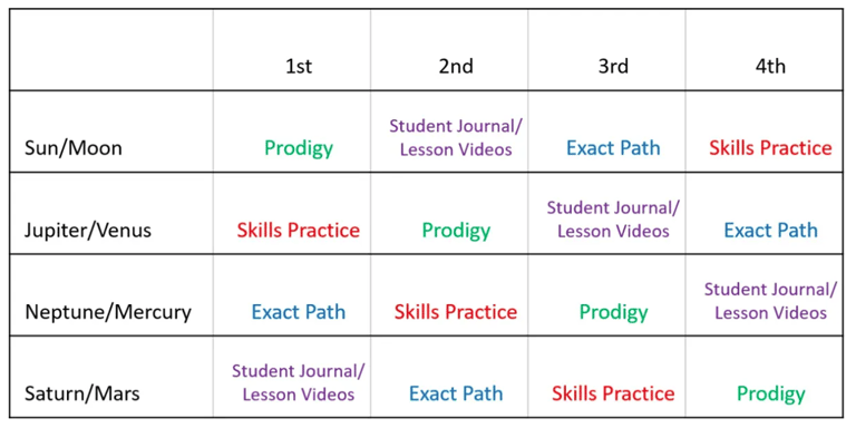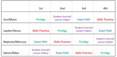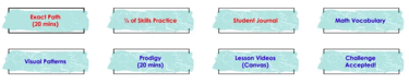 Students choose which activity to perform. Red tasks must be done daily. Blue tasks are complementary tasks that have specific learning objectives.